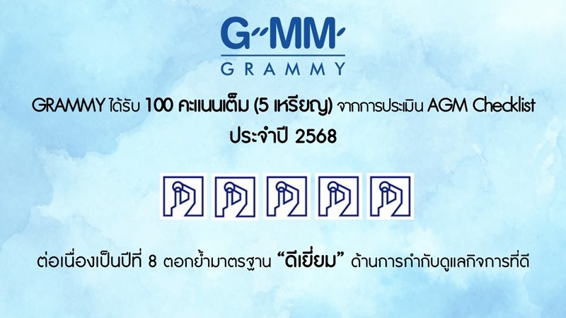 GRAMMY ได้รับ 100 คะแนนเต็ม (5 เหรียญ) จากการประเมิน AGM Checklist ประจำปี 2568 ต่อเนื่องเป็นปีที่ 8 ตอกย้ำมาตรฐาน "ดีเยื่ยม" ด้านการกำกับดูแลกิจการที่ดี