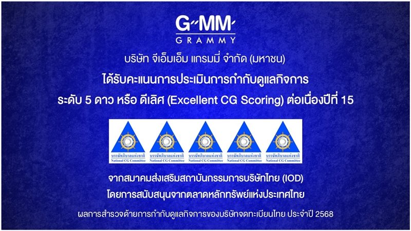 GRAMMY ได้รับคะแนนการประเมินการกำกับดูแลกิจการในระดับ 5 ดาว หรือ “ดีเลิศ” ต่อเนื่องเป็นปีที่ 15 สะท้อนให้เห็นถึงความมุ่งมั่นของบริษัทในการรักษามาตรฐานการกำกับดูแลกิจการที่ดีเยี่ยม